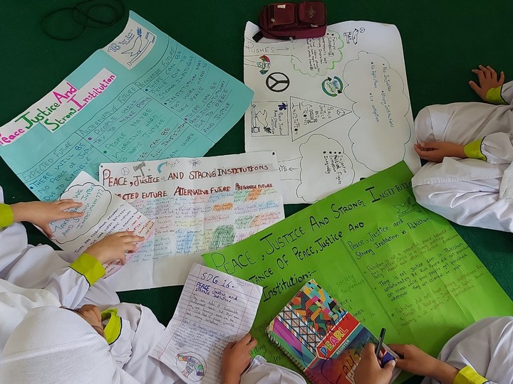 The rest of the foresight exercises was based on the SDGs. In groups, the adolescents had to select one of the 17 SDGs and reflect on the following questions in the context of Pakistan: What do you think is going to happen? (Expected futures, cause-effect thinking) / What might happen instead? (Alternative futures, contingent thinking) / What do you want to happen? (Preferred futures, value-based thinking).