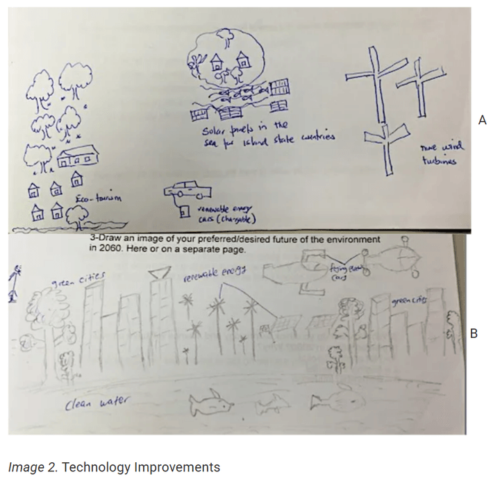 “The majority of students (49%; n=38) envisioned their preferred future as an altered city landscape that included solar panels, electric cars, wind farms and other uses of green technology.”